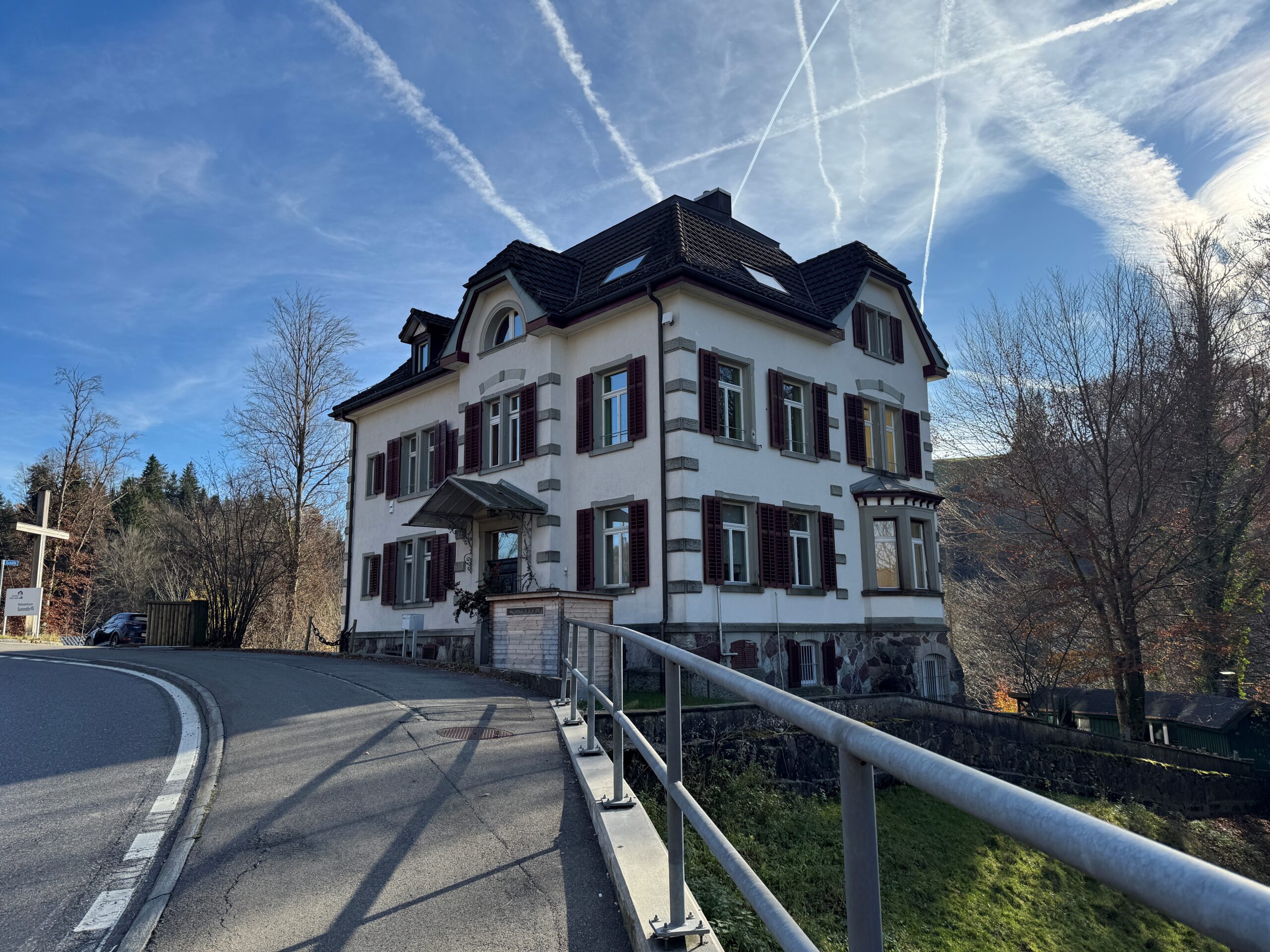 Die Wohn- und Arbeitssiedlung «Sunedörfli» präsentiert sich als vielseitiges Ensemble bestehend aus einer historischen Villa mit Backhüsli und Velounterstand, drei Wohngebäuden mit Kleintierstall, einem Atelier/Werkstatt sowie diversen forst- und landwirtschaftlichen Grundstücken. Das Verkaufsobjekt befindet sich zwischen der Ortschaft Hirzel und Sihlbrugg an der Zugerstrasse, oberhalb (südlich) der Sihl, rund 2.5 km westlich des Dorfkerns Hirzel und rund 1.5 km von Sihlbrugg.